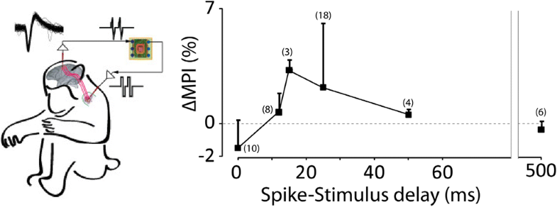 Changes in cortico-spinal connectivity via closed-loop stimulation. Spiking activity of identified cortico-motorneuronal (CM) cells are recorded from motor cortex, and used to trigger intraspinal stimulation near the target of these CM cells [9]. When the delay of the closed-loop stimulation is less than the natural conduction velocity in these circuits, connection strengths are reduced. When delays are set such that stimulation arrives shortly after the natural activity, connectivity is strengthened as measured by mean-percent increase (ΔMPI) in the spike-triggered average response of the target muscle EMG. Reprinted by permission from Elsevier-Neuron, spike-timing-dependent plasticity in primate corticospinal connections induced during free behavior, Nishimura et al., COPYRIGHT 2013