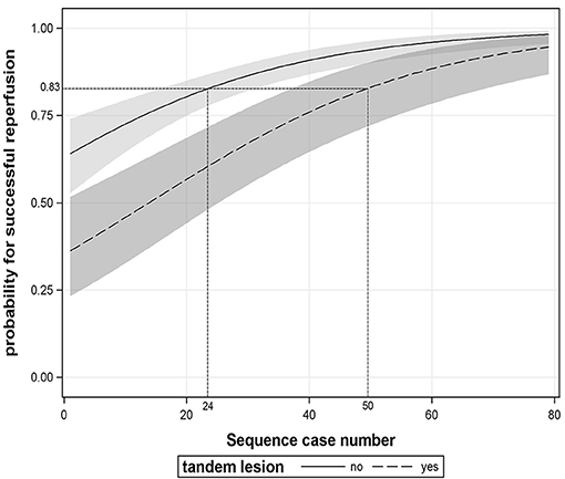 In addition, we found that patients with tandem lesions had a lower proportion of SR than those with isolated intracranial artery occlusion (OR 0.320, 95% CI: 0.177–0.578, P < 0.001, see Supplementary Table 4). The average predicted probability of SR in the 29th case was 83% according to Figure 2D. The operators needed to complete at least 24 cases without tandem lesions to obtain an equivalent predicted probability of SR; however, for patients with tandem lesions, the number of procedures required substantially increased to 50, as shown in Figure 4.