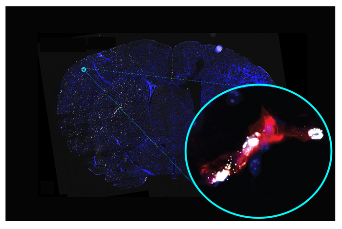image: In the inset, the small blood vessels in the brain, i.e. the cerebral microvasculature, can be seen at a higher magnification stained in red and the molecules that weaken the blood brain barrier are labeled in white. view more