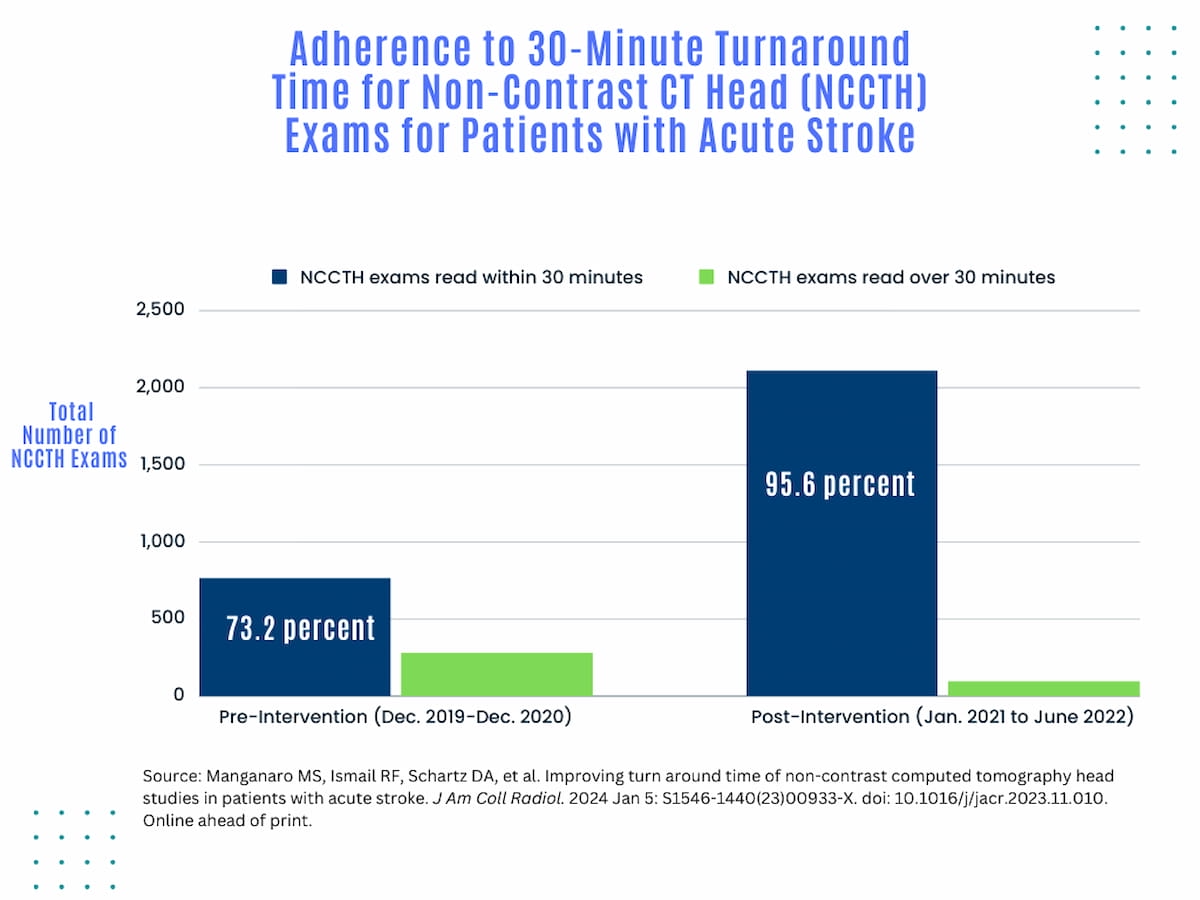 Modifications to the radiology workflow, including the use of a structured report template, improved adherence for 30-minute turnaround times for acute stroke head CT results from 73.2 percent to 95.6 percent, accordingly to new research.