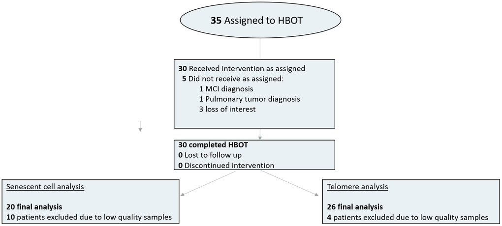 Thirty-five individuals were assigned to HBOT. Five patients did not complete baseline assessments and were excluded. All 30 patients who completed baseline evaluations completed the interventions. Due to the low quality of blood samples (low number of cells or technician error), four patients were excluded from the telomere analysis and 10 patients from senescent cell analysis (Figure 1). The baseline characteristics and comparison of the cohorts following exclusion of the patients are provided in Table 1. There were no significant differences between the three groups (Table 1).