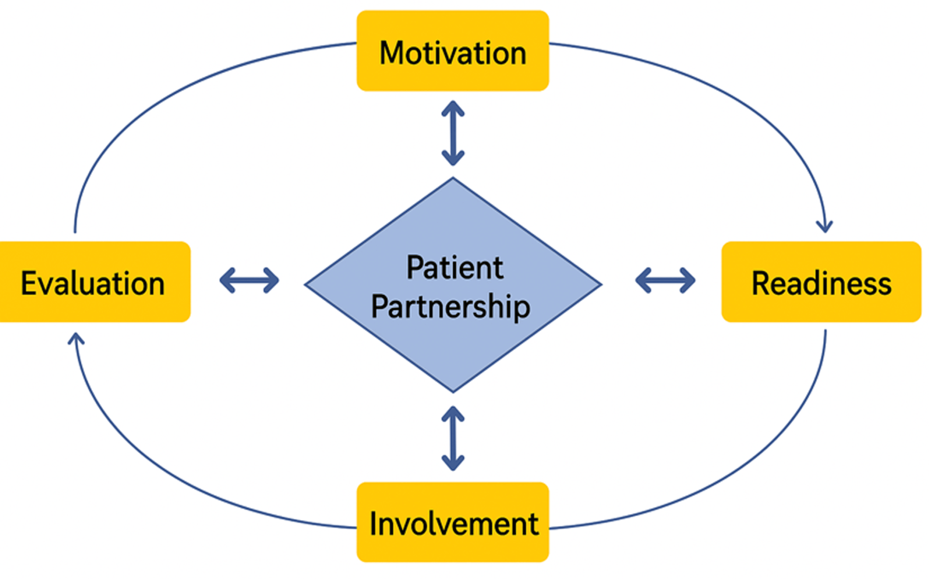 The patient partnership model has four stages: motivation, readiness, involvement, and evaluation [14], as summarised in Figure 1. Motivation involves the clinician and patient recognising the condition and the importance of active engagement [14]. Readiness focuses on preparing the patient with knowledge, allowing for active participation [14]. Involvement ensures continued collaboration to enhance health outcomes and quality of life [14]. Finally, regular evaluation assesses and strengthens the partnership for sustained and optimal outcomes [14].