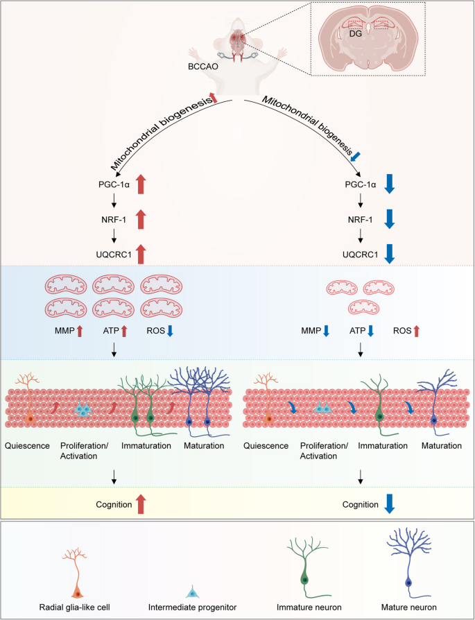 We observed that the time course of mitochondrial biogenesis matched that of neurogenesis in the hippocampal dentate gyrus (DG) following GCI. Promoting mitochondrial biogenesis enhanced neurogenesis in the DG, lengthened neurites, and improved mitochondrial function, collectively alleviating cognitive deficits following stroke. Conversely, inhibition of mitochondrial biogenesis had the opposite effect. In addition, ubiquinol-cytochrome c reductase core protein 1 (UQCRC1) was identified as a crucial component of mitochondrial biogenesis(How was it delivered and the amounts?). UQCRC1 knockdown impaired neurogenesis and cognitive abilities in mice.