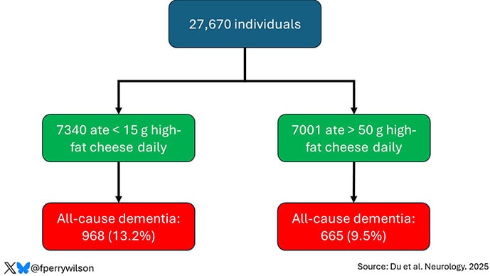 The study looked at other dairy intake as well and, frankly, that made me more confused about these cheese results. If it’s the protein content in the cheese that is beneficial, then we should see a protective signal from low-fat cheese intake, but we don’t. If it’s the fat that is protective, you’d think we’d see a protective signal from butter, which is about 80% milkfat, but we don’t. So, we’re left having to wave our hands about some complex interaction of various brain-protecting substances that exist only in high-fat cheeses. Possible? Maybe. Likely? I don’t think so.