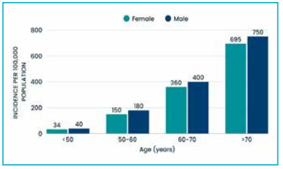 Figure 2: The graph show distinct patterns across different age groups and sexes. Men had a higher incidence of stroke than women in the younger (15–49 years) and middle-aged (50–69 years) groups. However, in the older age group (70+ years), the incidence rates for women approached and were similar to those of men. This indicates that while younger and middle-aged men are more at risk, older women face nearly the same risk of stroke as men.