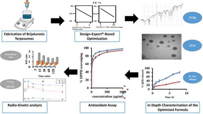 This research focuses on creating a novel Brijaluronic-based terpesomal system capable of transporting quercetin (QER) efficiently to the brain. The vesicles were fabricated through an ethanol-injection method and then refined using a structured optimization approach in Design-Expert® software. The influence of three main formulation parameters: terpene-to-drug ratio, surfactant type, and hyaluronic acid amount were evaluated. The optimization process was designed to maximize EE%, minimize VS, and maintain ZP within an acceptable stability range. The optimal formula hit a desirability target of 0.957. It achieved an 88.66% EE%, featured nano-carriers sized at 72.09 nm, and had a stable charge of − 26.5 mV. Physicochemical characterization studies revealed a spherical morphology, an in-vitro release defined by a biphasic profile, and a secure structural integrity which was validated using FTIR analysis. Moreover, over the course of three months, the formulation did not degrade or change significantly, demonstrating its high degree of stability. Notably, terpesomes demonstrated a ~ 3.5-fold enhancement in antioxidant activity, reducing the IC₅₀ from 12.98 ± 0.82 µg/mL to 3.68 ± 0.20 µg/mL, representing a statistically and pharmacologically significant improvement. Radio-kinetic assessments further supported its potential for precise brain targeting. The brain/blood was highest for the optimized formulation at all-time points. Compared with the nasal QER solution, Technetium-99m ([99mTc]Tc)-QER-loaded terpesomes exhibited superior brain-targeting efficiency, as evidenced by higher AUC, shorter Tmax, and greater Cmax values in the brain. Taken together, the Brijaluronic terpesomes represent a highly promising, innovative nano-platform. This engineered system appears poised to boost the effectiveness of QER in neurotherapeutic applications.Highlights